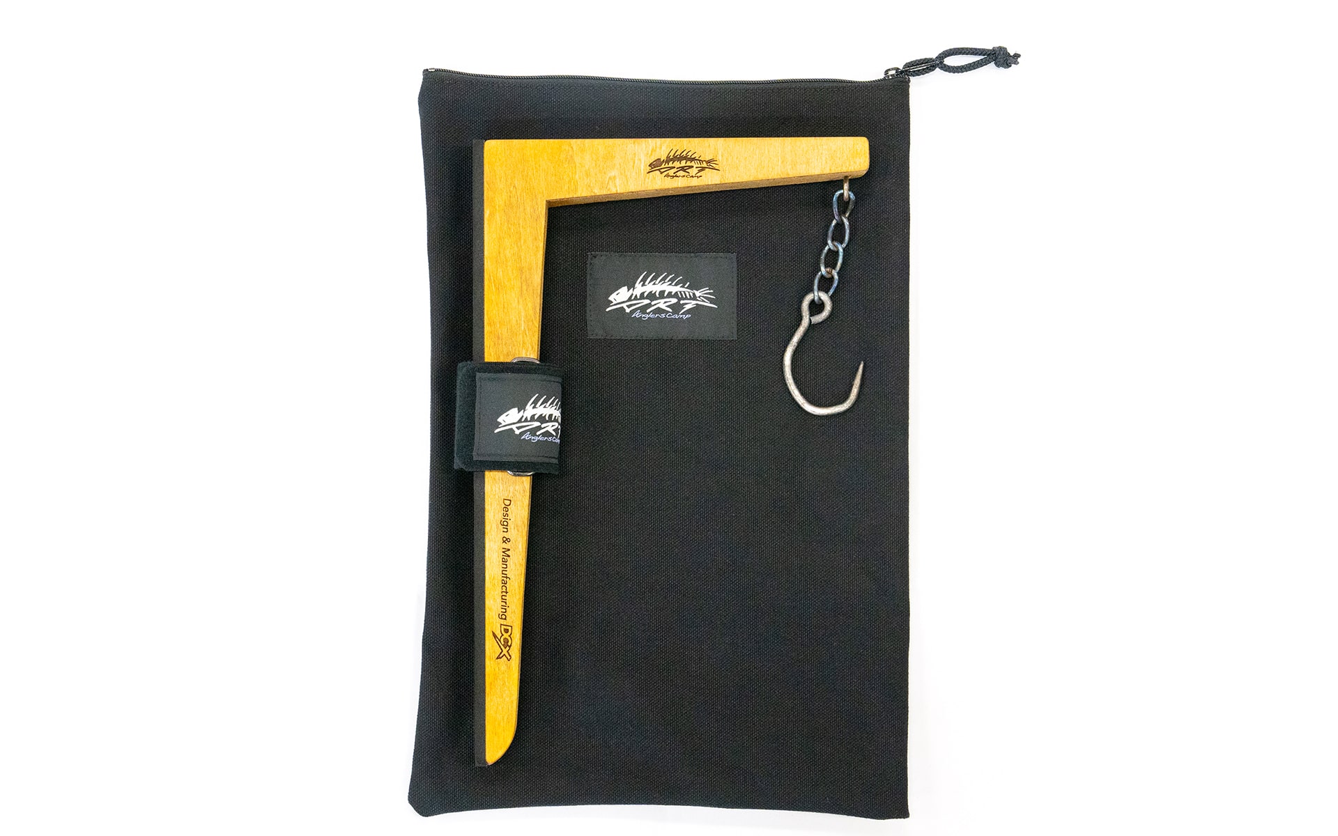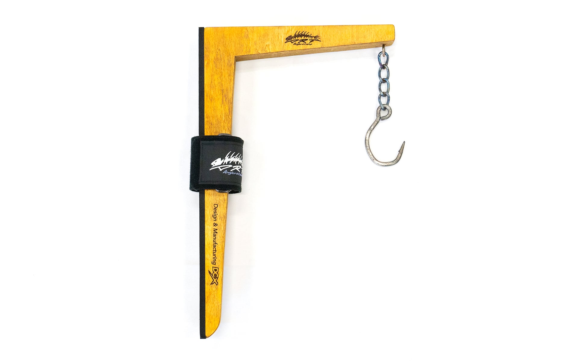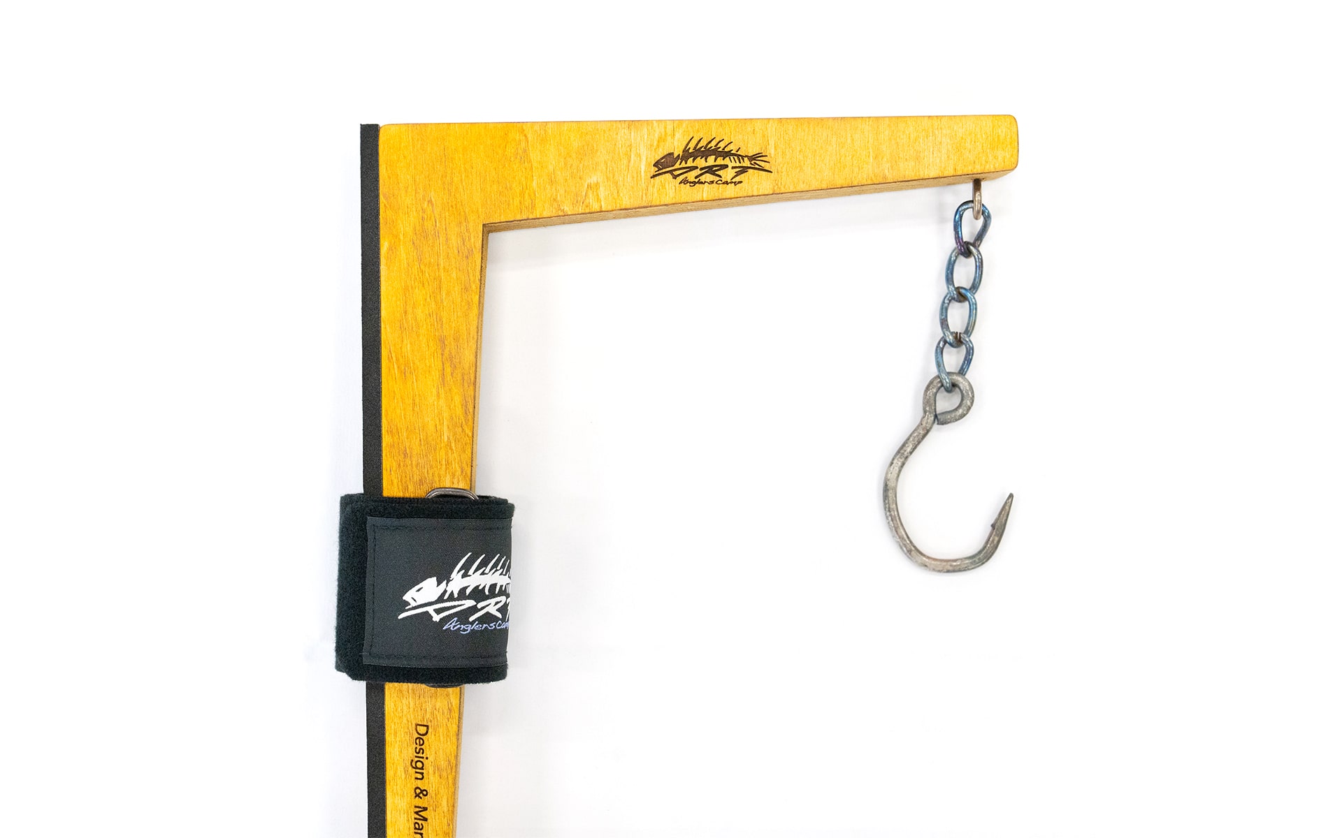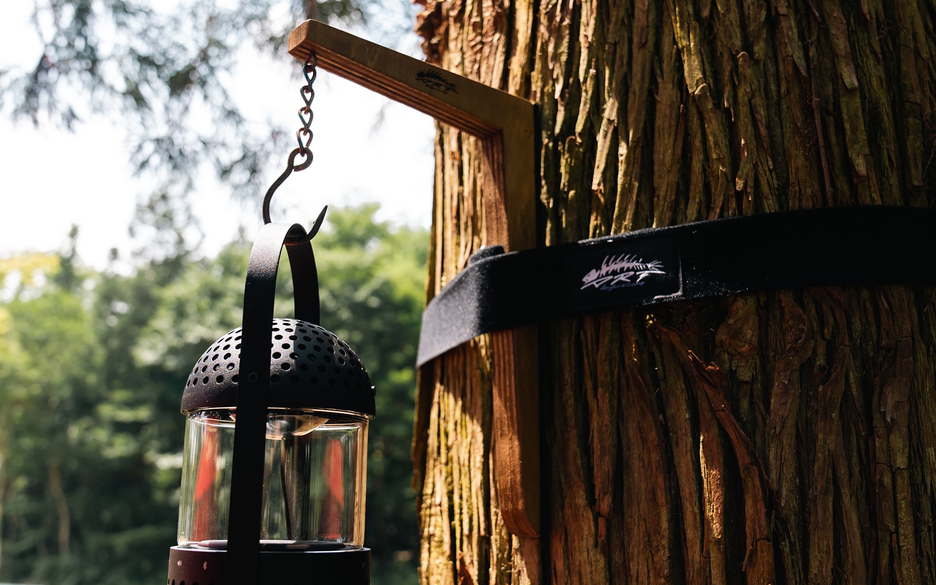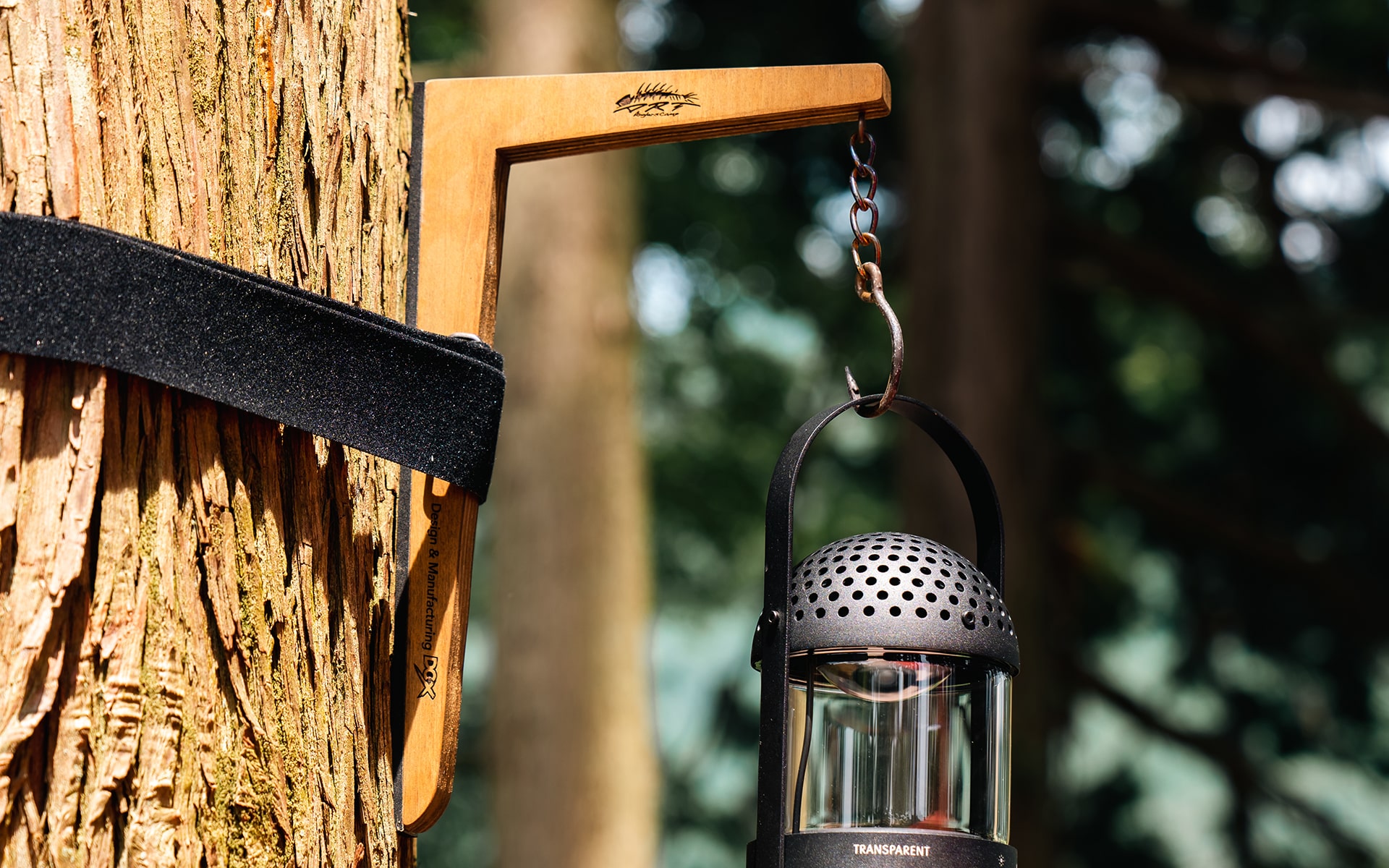 本物の釣り針(クエ用)を使用したランタン掛け。針は焼き入れてリアルエイジング加工を施しております。ウッド部分にはレーザーマーキングロゴ、引っ張り強度のあるマジックテープ採用。