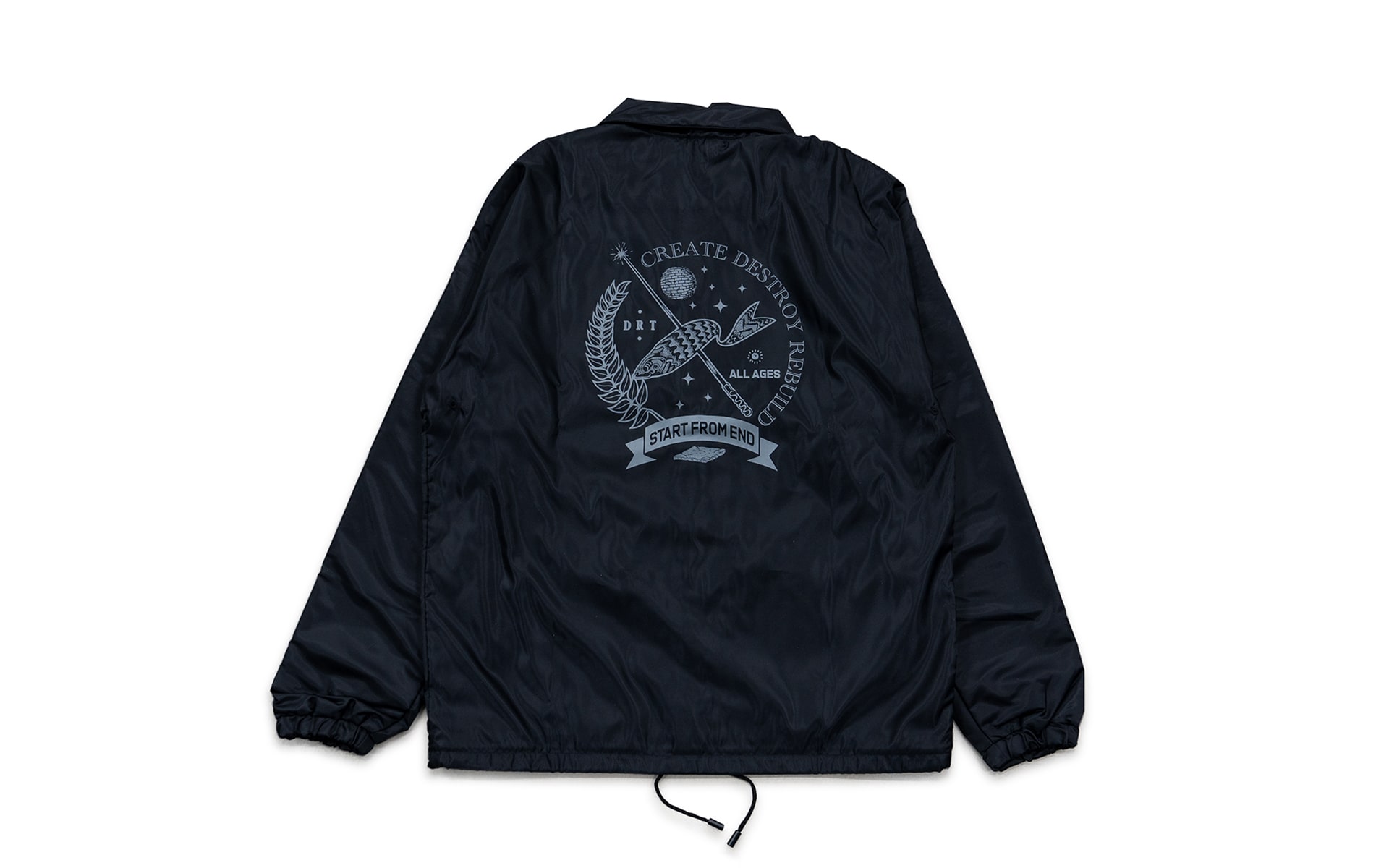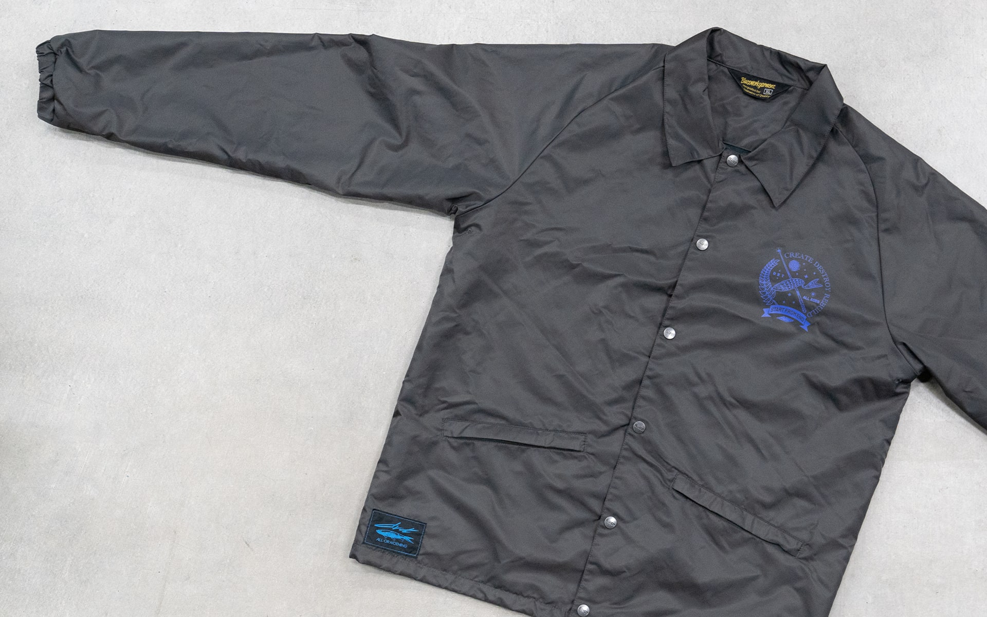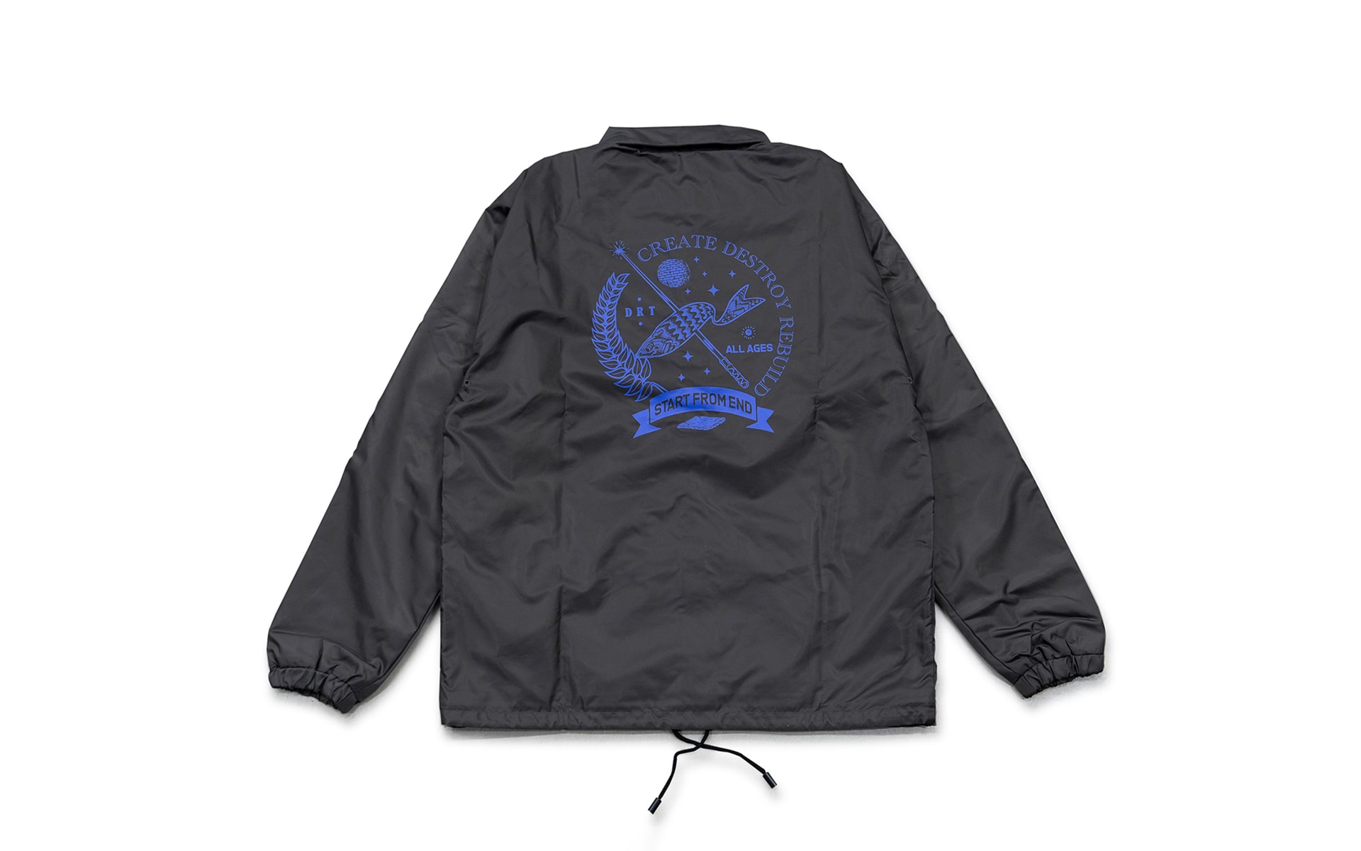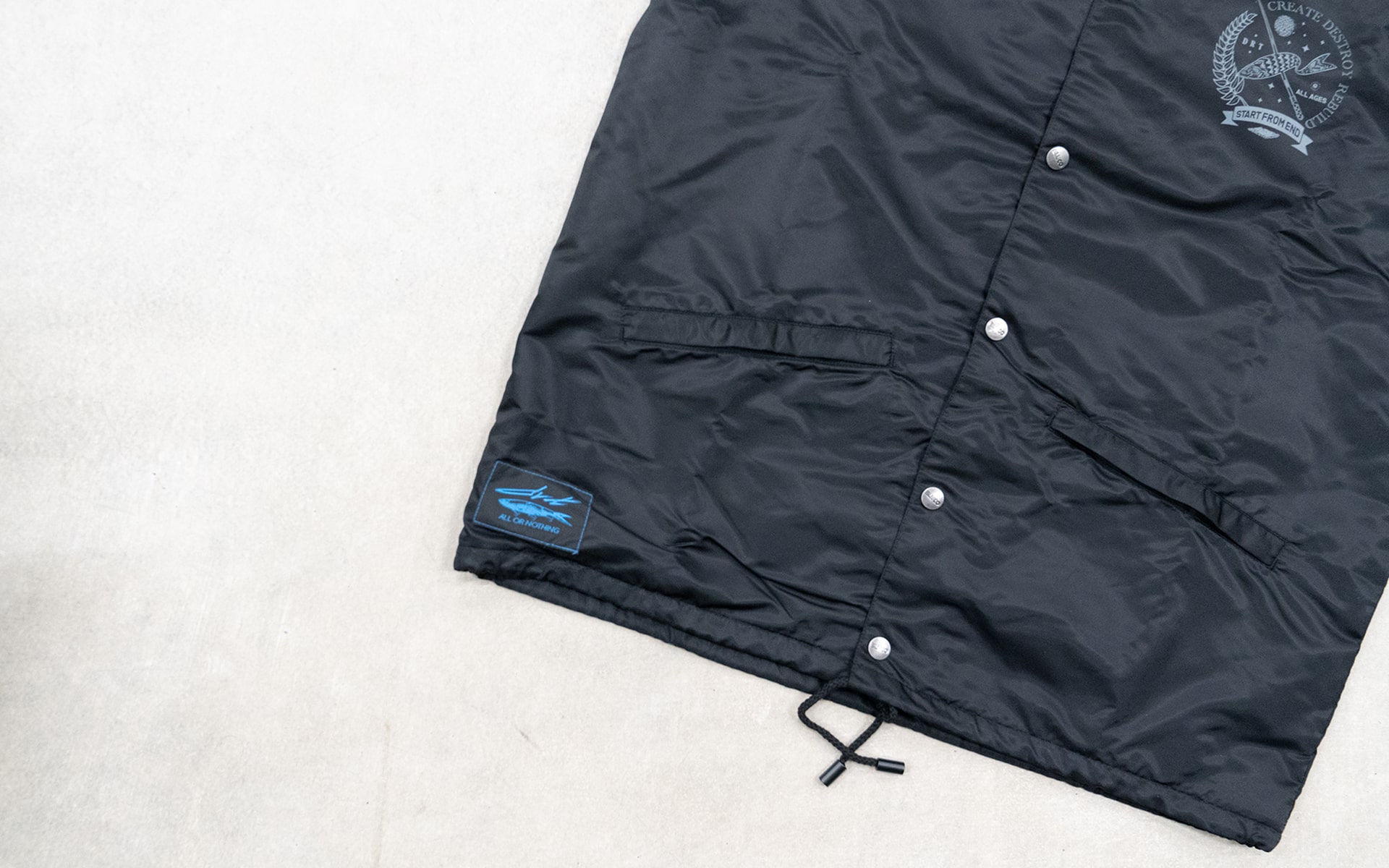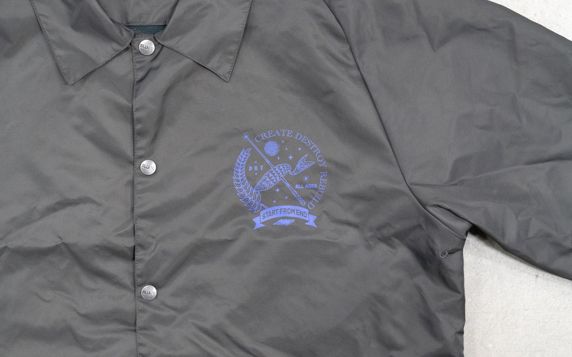 END×DRT BLUCOさんの60/40 COACH JACKETをベースに数々のHARDCORE/PUNKのフライヤーアートワークを手掛ける東京のイラストレーター”START FROM END”さんのイラストをNEW CURRENT WORKさんにプリントを依頼。