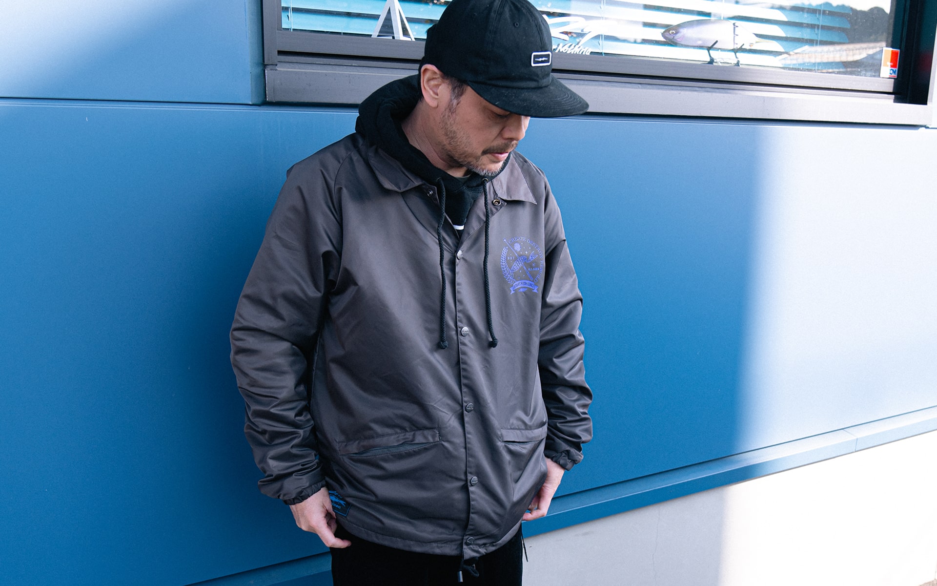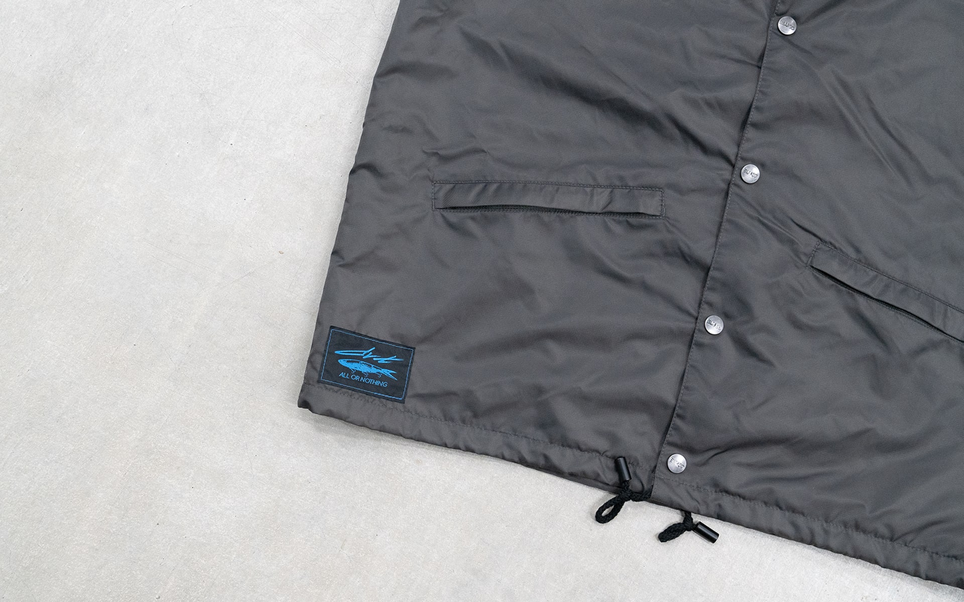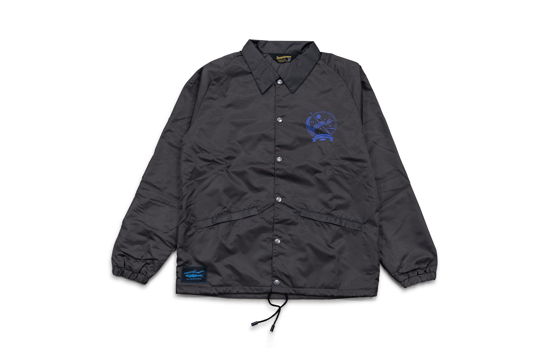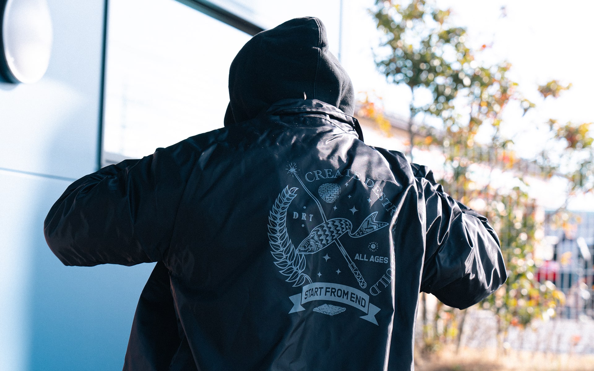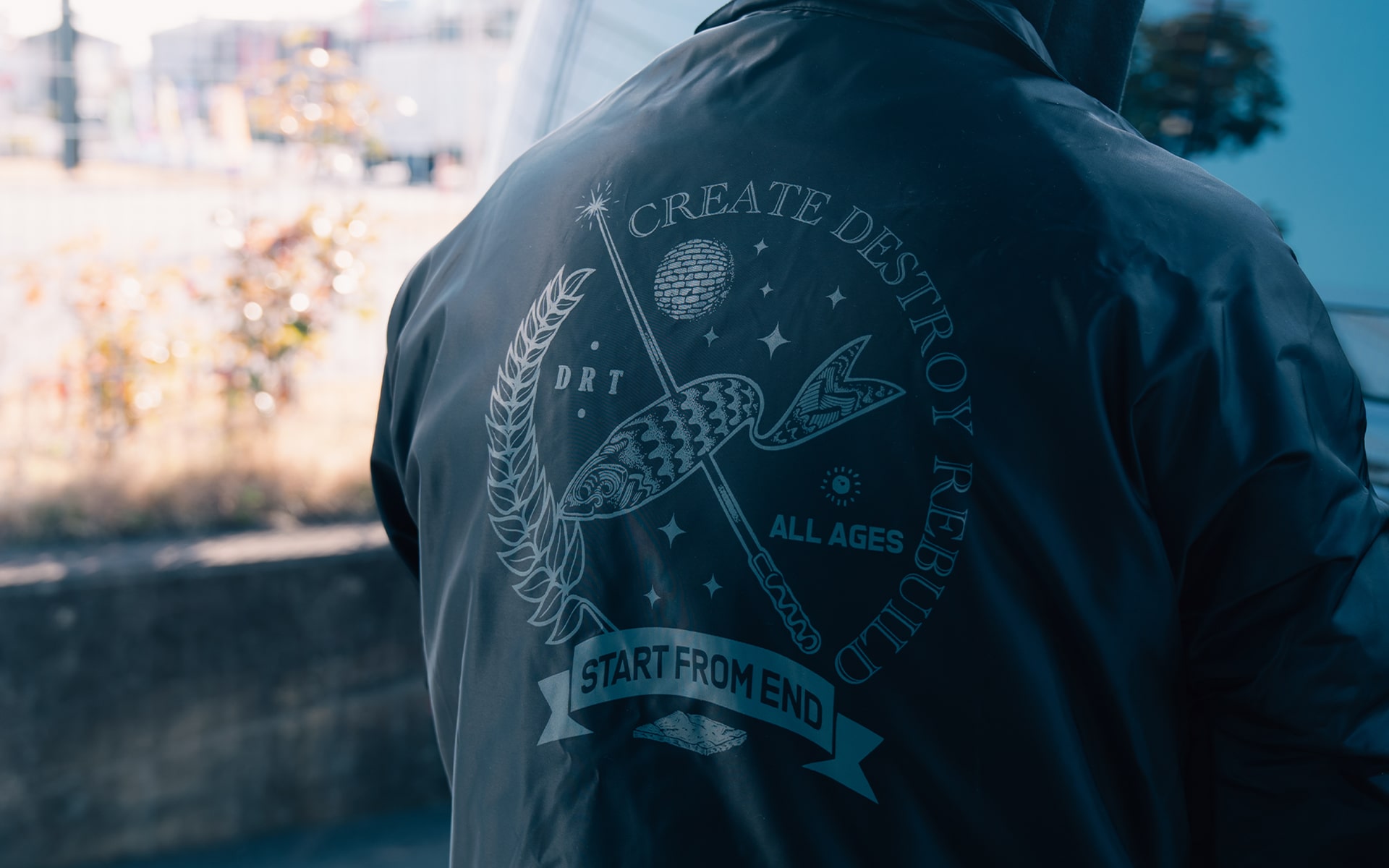 END×DRT BLUCOさんの60/40 COACH JACKETをベースに数々のHARDCORE/PUNKのフライヤーアートワークを手掛ける東京のイラストレーター”START FROM END”さんのイラストをNEW CURRENT WORKさんにプリントを依頼。