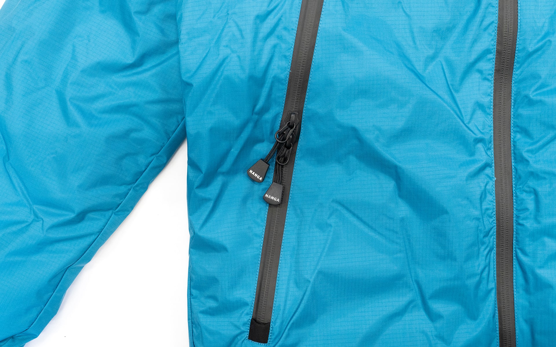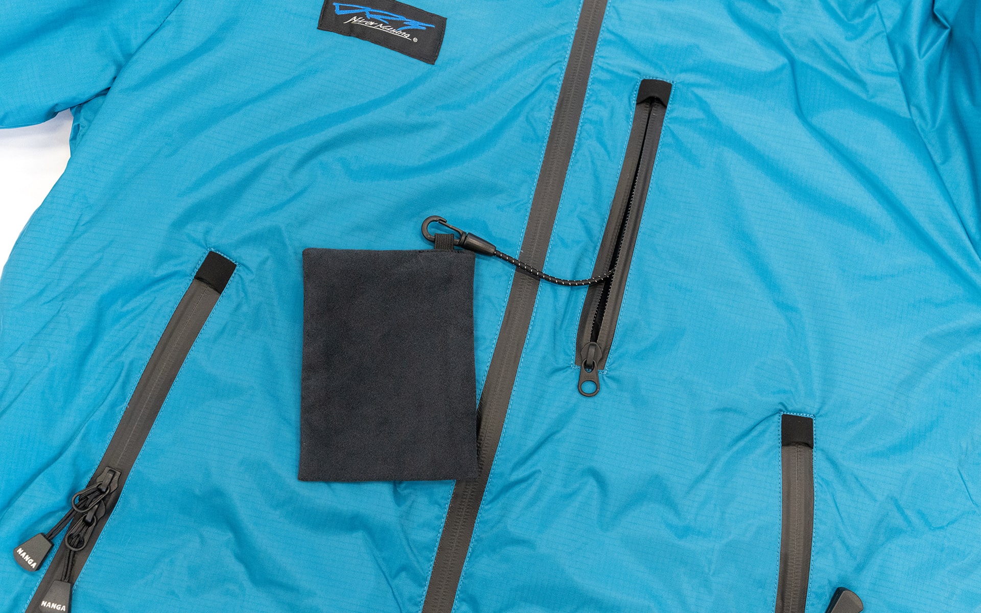 NANGA別注。DRT SPEC でカスタムしたAURORA超撥水羽毛”UDD”770FP仕様。DXの羽毛に超撥水加工を施し、湿気を通すが水を吸わない高機能ダウン。左胸ポケット内部にサングラス拭きを追加。水中から見た水面上の世界に溶け込みやすい魚目線のカモフラージュカラー。