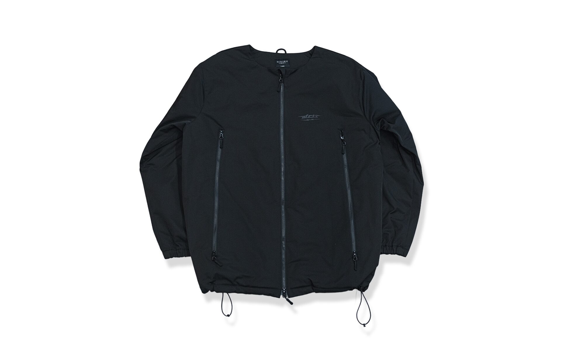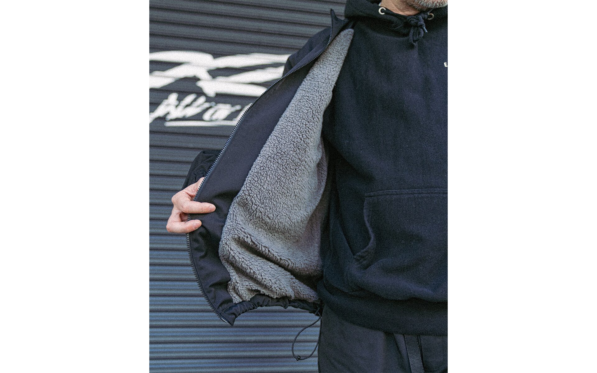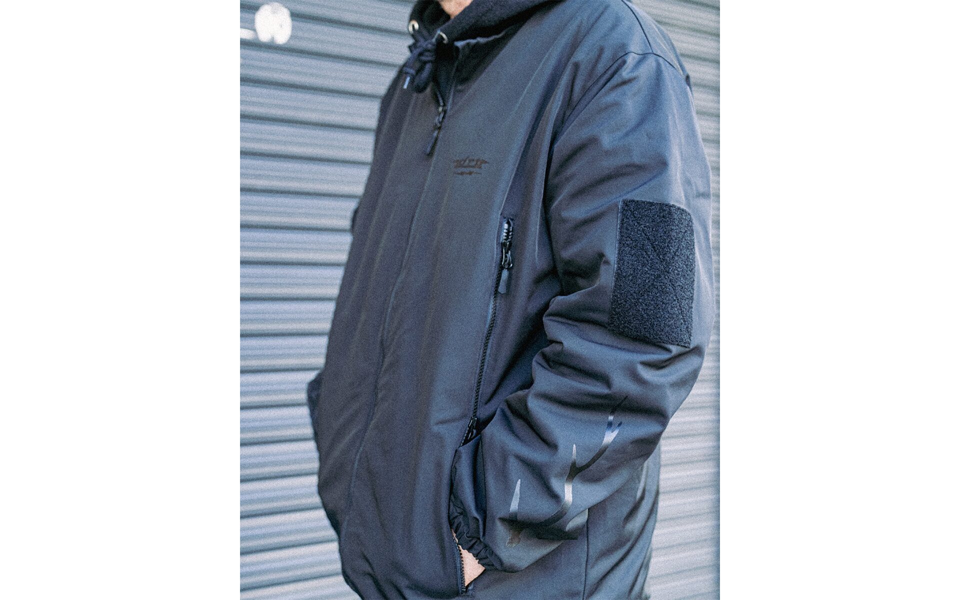 フーディ着用を想定して襟無し仕様。各所ドロッパーコード付きでサイズ〜シルエットを調整可能。真冬のインナーウェアとして、また風を通さない生地になっているのでアウターとしても機能します。