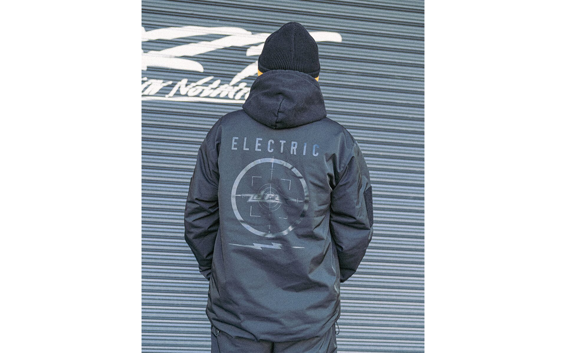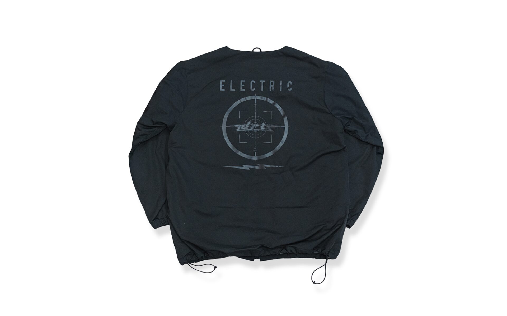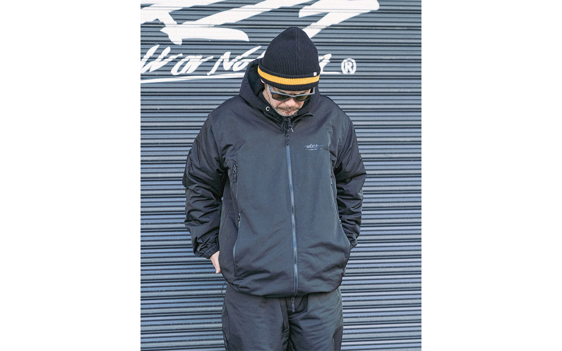 フーディ着用を想定して襟無し仕様。各所ドロッパーコード付きでサイズ〜シルエットを調整可能。真冬のインナーウェアとして、また風を通さない生地になっているのでアウターとしても機能します。