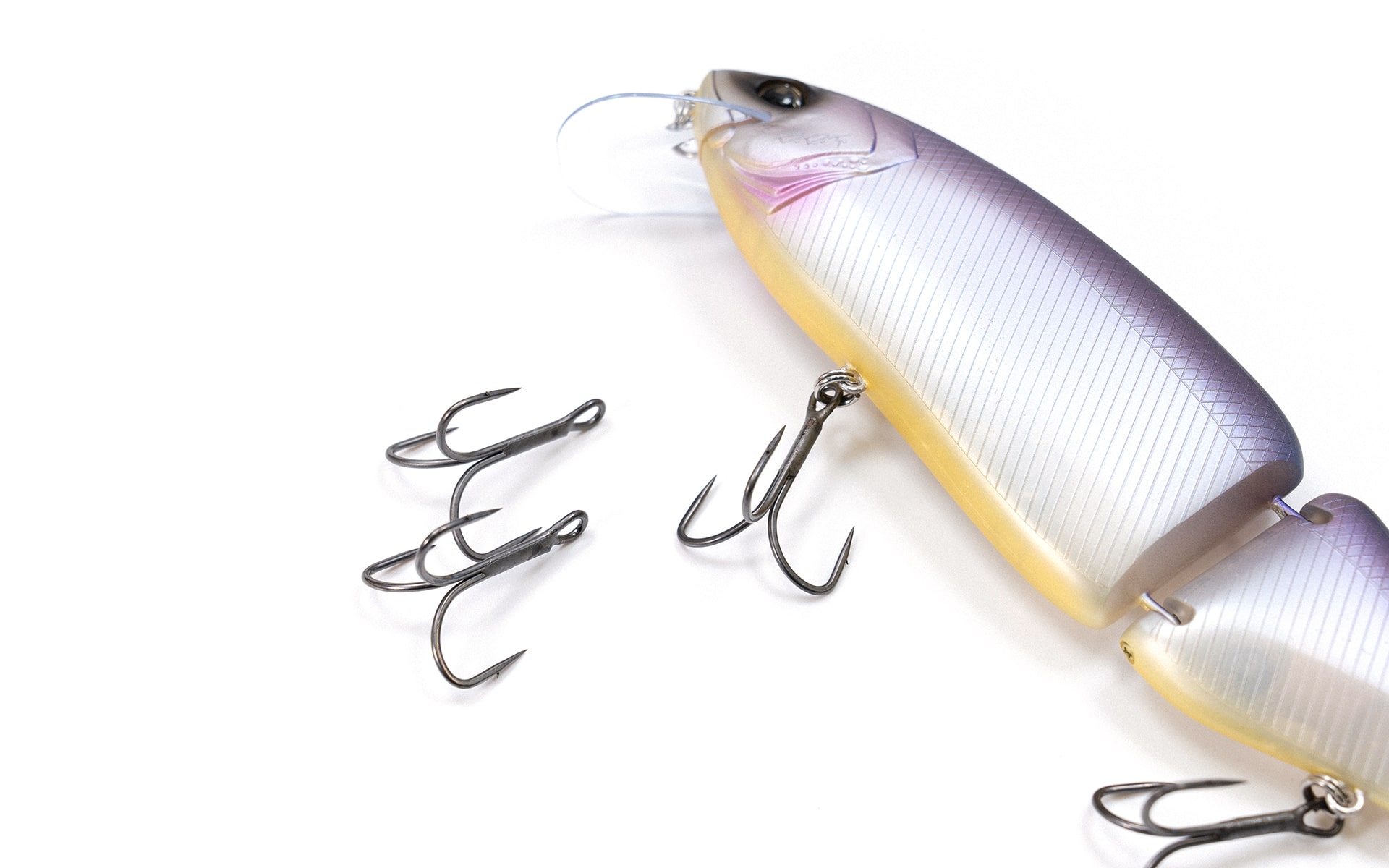 フッキング~負荷が掛かった瞬間に内側に向かって働く針掛かりの仕組みはフックが大きくなればなるほどバーブによって刺さり込みを妨げられてきた。アウトバーブにすることでバーブレス並みの滑らかな刺さり込みを実現し、長くデザインされたスロート&スプロートベンドは掛けた魚の保持力に優れています。キャストミスや強風時、リップレスグライドベイトのオーバーランなどビッグベイトにありがちな”エビる”現象もアウトバーブにすることで解除しやすくなっています。つや消しステルスグレーは警戒心ある魚にも効果的です。