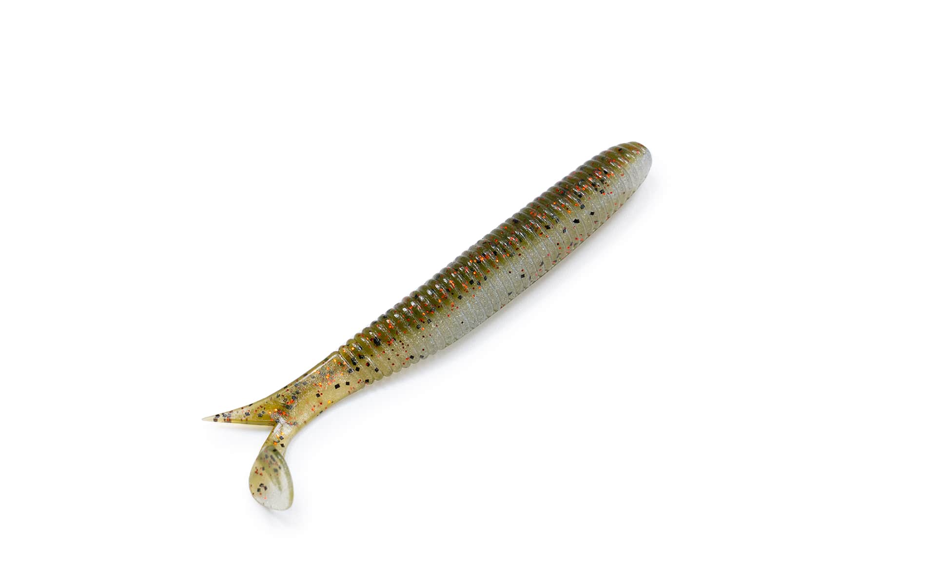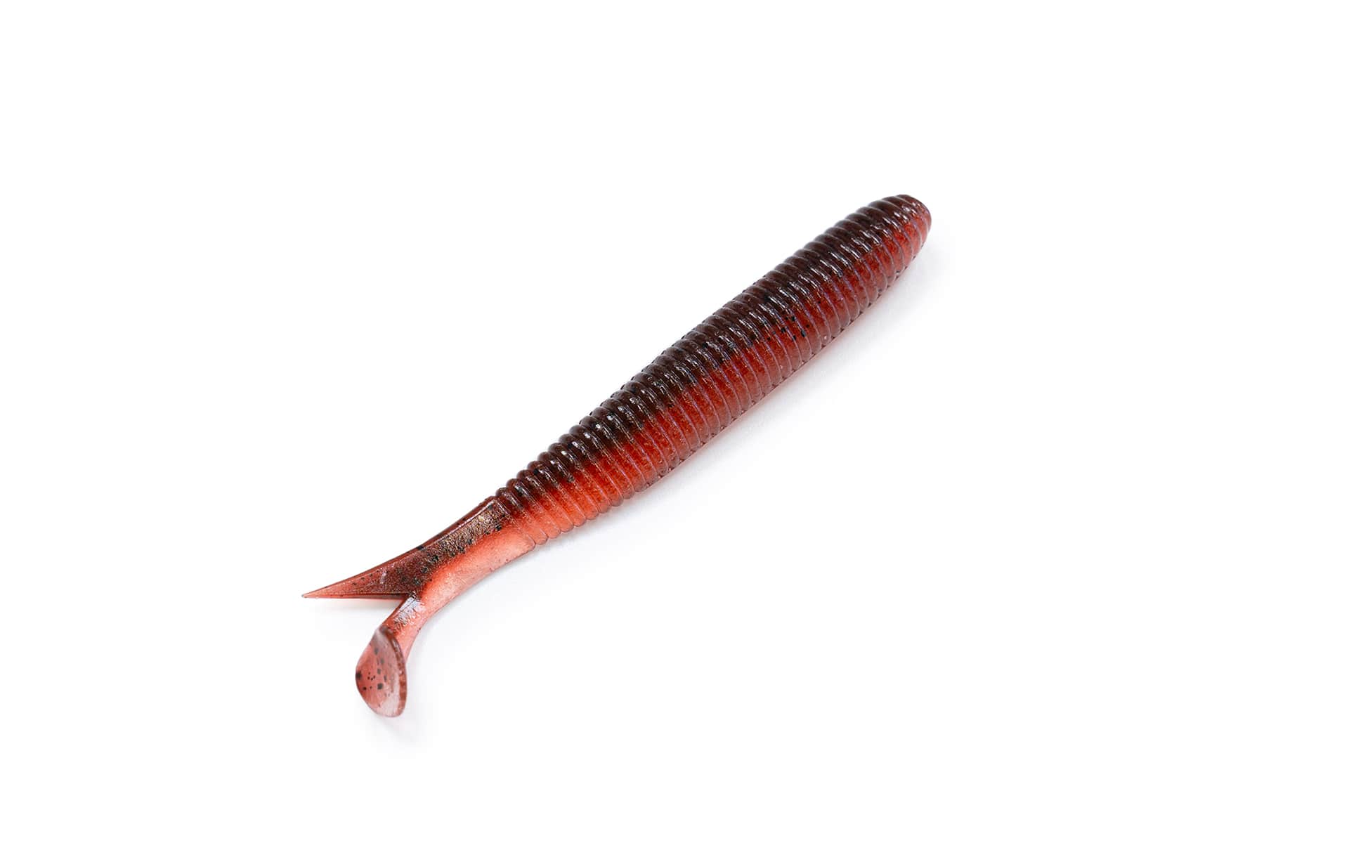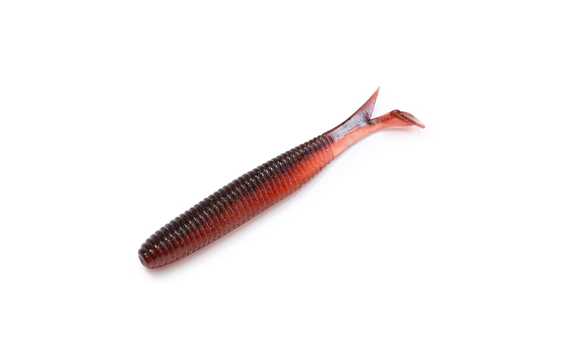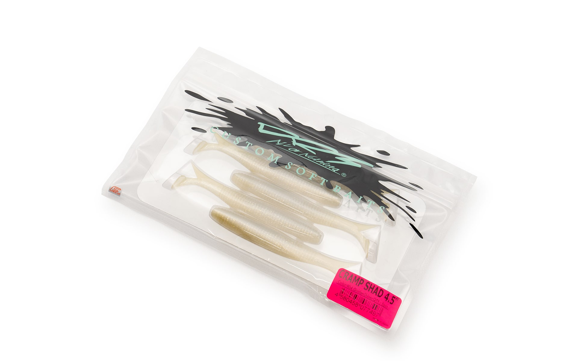 ジグヘッド、ノーシンカー、ウェイテッド。基本巻くだけ。ジグヘッドのシェイクを織り交ぜたスイミングでは後方テールがブレーキとなりロール強で移動距離を抑えてスイミングさせる事が出来ます。耐久性とアクションを考慮した硬度。ワーム単体で10gのウエイトがあり、飛行姿勢を考慮したボディデザインにより飛距離も抜群。チェイス〜最後の喰わせのトリガーとなるVテール+ハイピッチシャッドテール=CRAMPTAIL”痙攣シャッド”でバイトを誘発。
