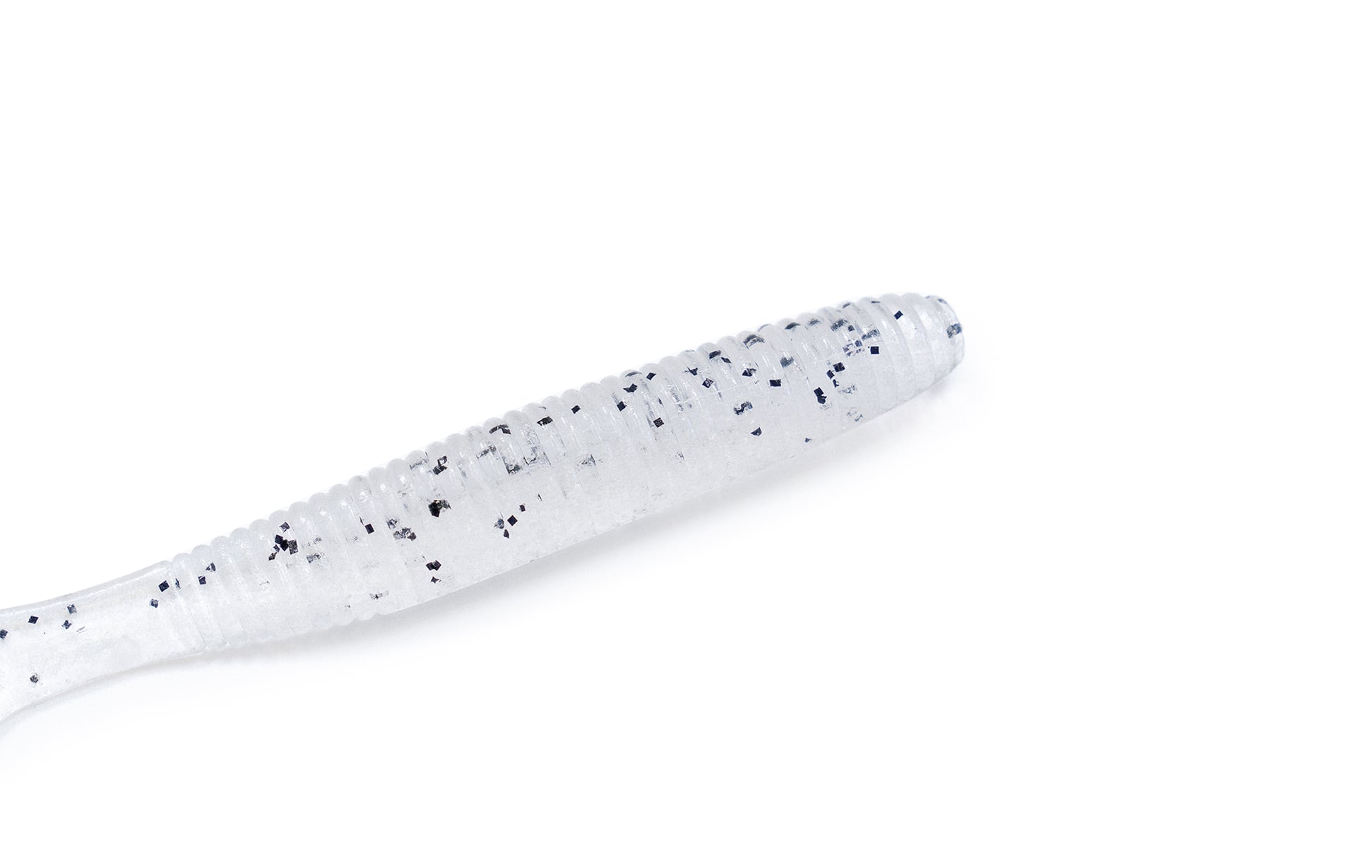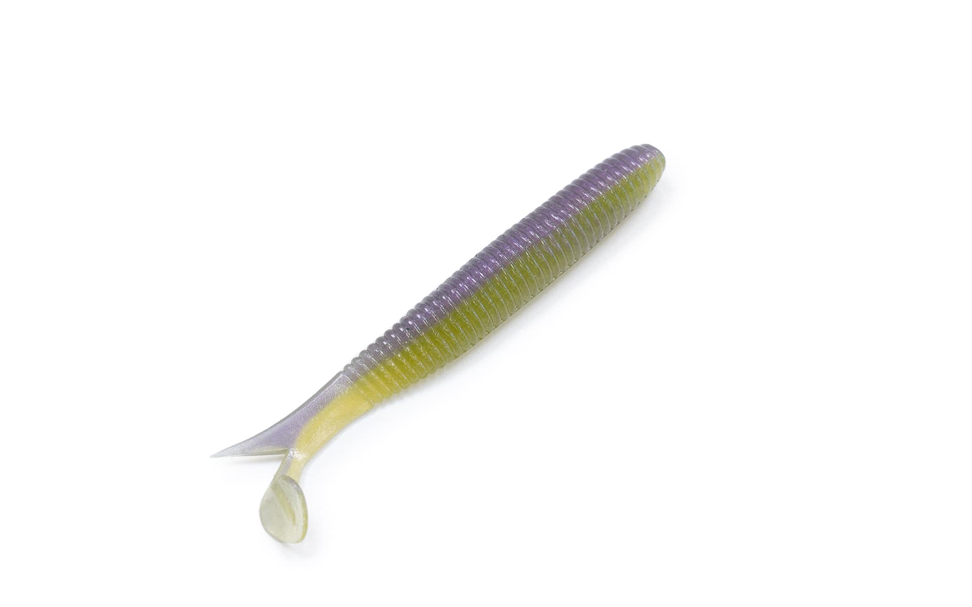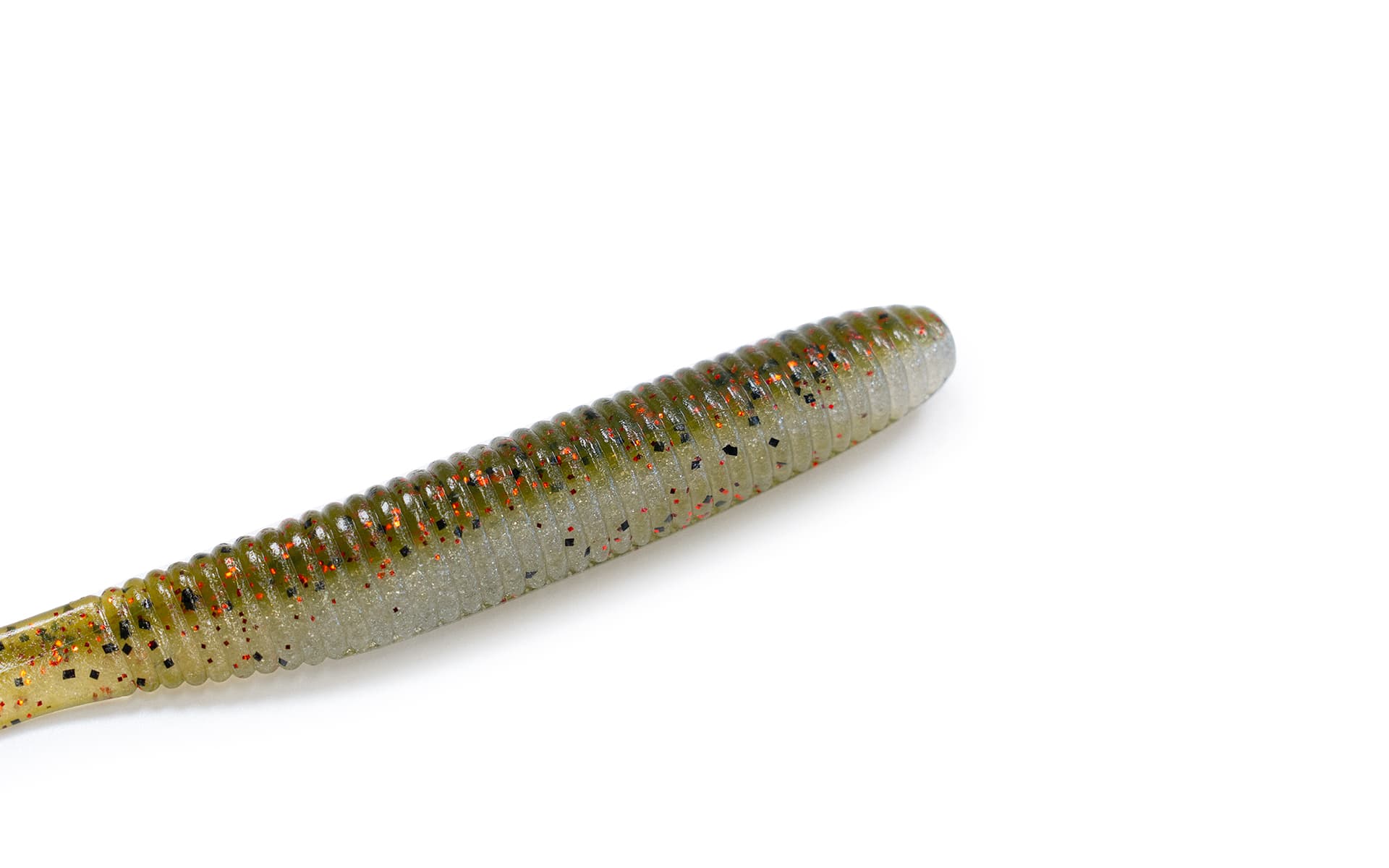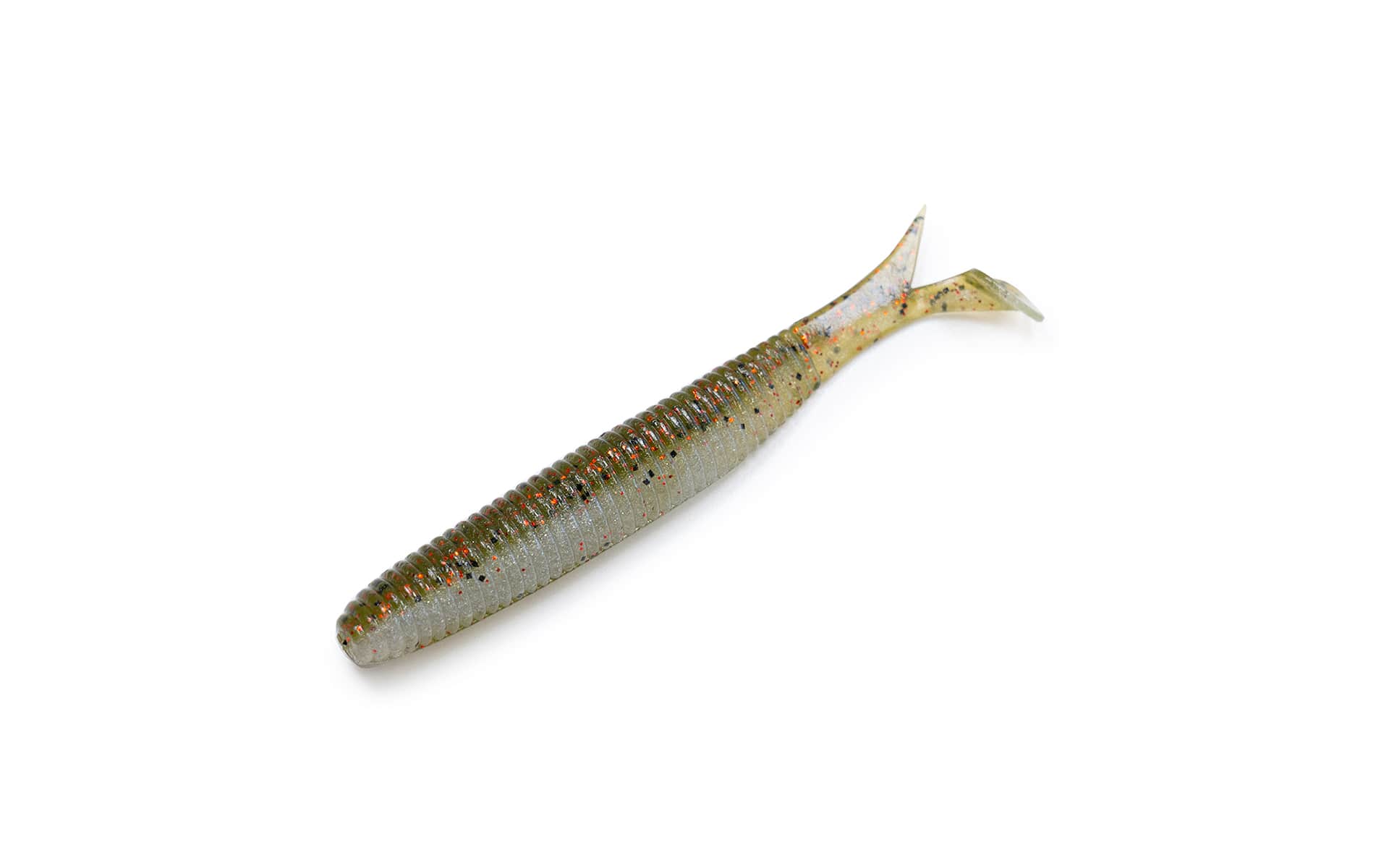 ジグヘッド、ノーシンカー、ウェイテッド。基本巻くだけ。ジグヘッドのシェイクを織り交ぜたスイミングでは後方テールがブレーキとなりロール強で移動距離を抑えてスイミングさせる事が出来ます。耐久性とアクションを考慮した硬度。ワーム単体で10gのウエイトがあり、飛行姿勢を考慮したボディデザインにより飛距離も抜群。チェイス〜最後の喰わせのトリガーとなるVテール+ハイピッチシャッドテール=CRAMPTAIL”痙攣シャッド”でバイトを誘発。